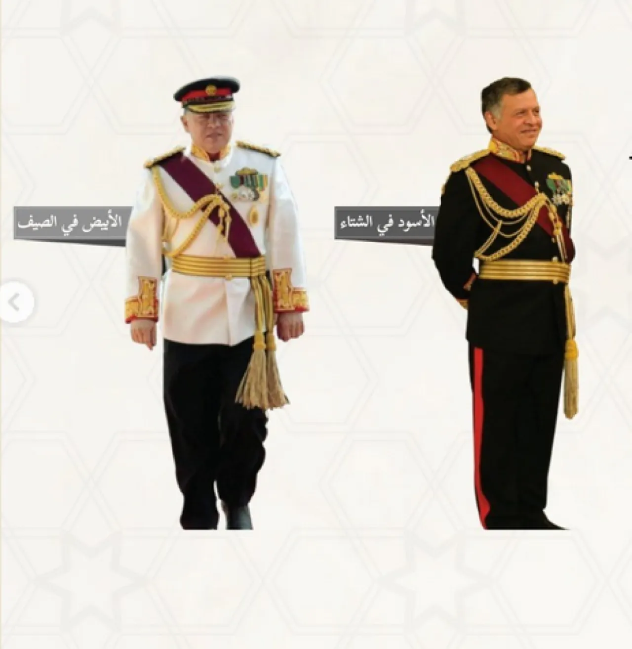 The throne attire consists of two colors: black worn in winter, and white in summer. The king wears the official military uniform, adorned with medals and decorations, which signifies the military traditions of the Jordanian state, and his role as the supreme commander of the armed forces.