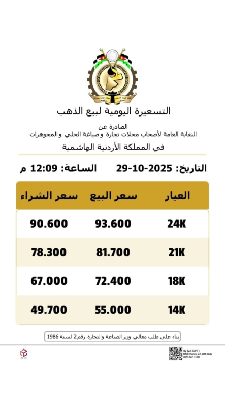 كما بلغ سعر بيع غرام الذهب لعيارات 24 و18 و14 على التوالي 93.6 دينار، 71.40 دينار، و55 دينارًا.