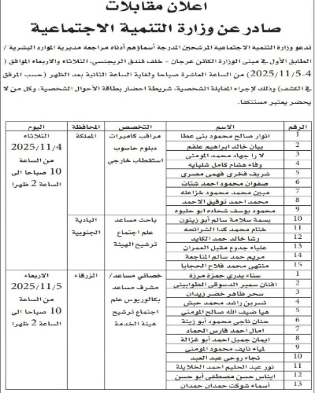 خبرني - دعت وزارة التنمية الاجتماعية اليوم الخميس التالية أسماؤهم إلى مراجعتها في مبناها الكائن في عرجان خلف فندق الريجنسي خلال الفترة التالية الثلاثاء والأربعاء الموافق (4-5 /11/2025 ) من الساعة العاشرة ولغاية الساعة الثانية بعد الظهر وذلك لإجراء المقابلة الشخصية، ومن لا يحضر يعتبر مستنكفا.