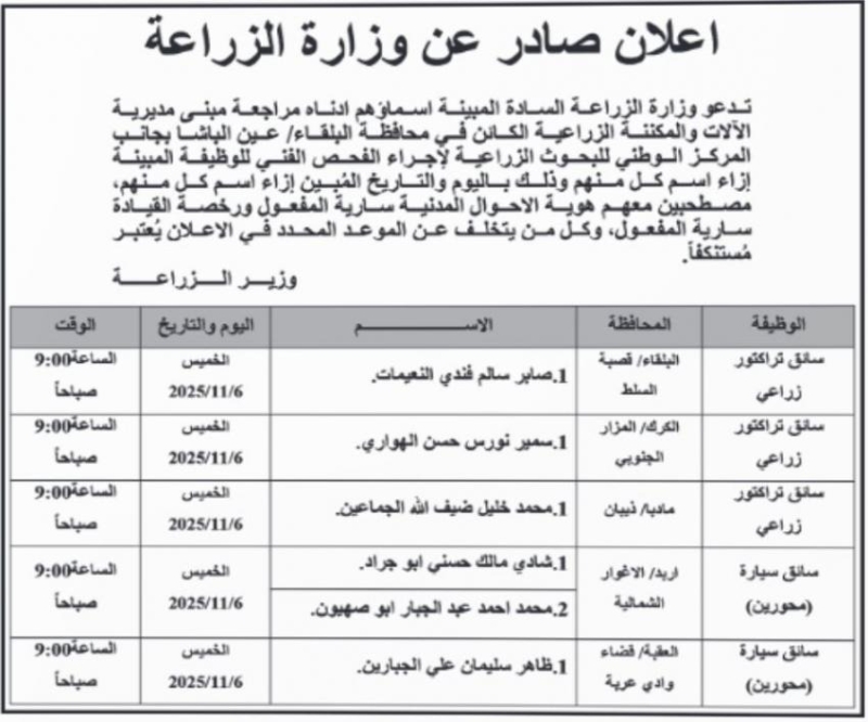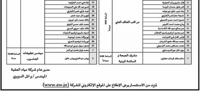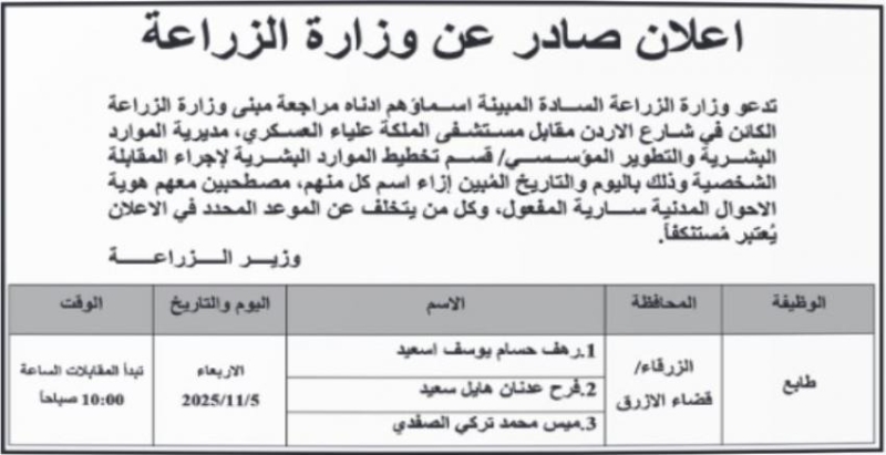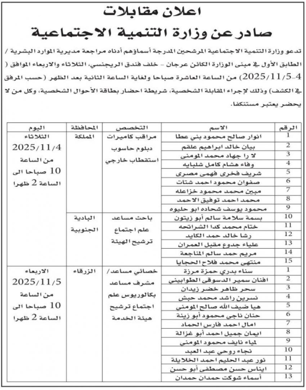 خبرني - دعت وزارات ومؤسسات حكومية، اليوم الخميس التالية أسماؤهم لإجراء المقابلات الشخصية.