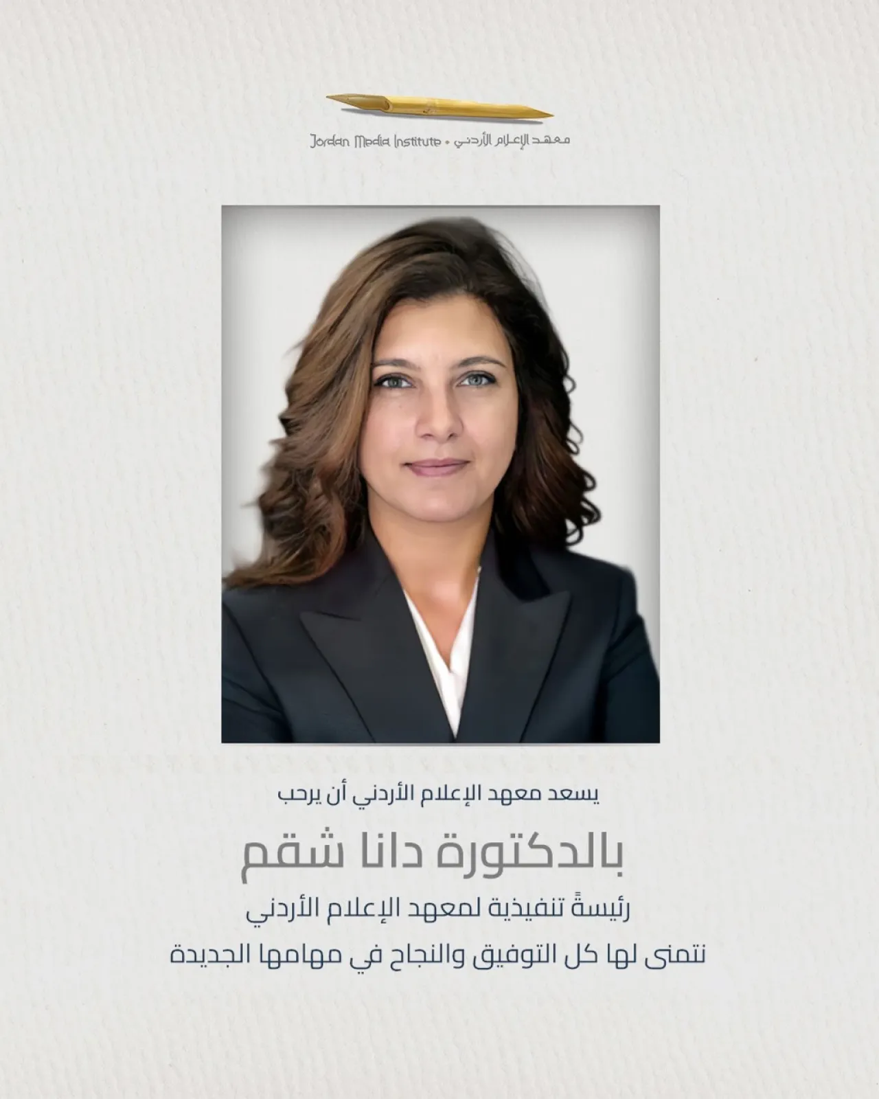 خبرني - صدر قرار اليوم الثلاثاء بتعيين الدكتورة دانا سعيد شقم رئيسةً تنفيذية لمعهد الإعلام الأردني.
