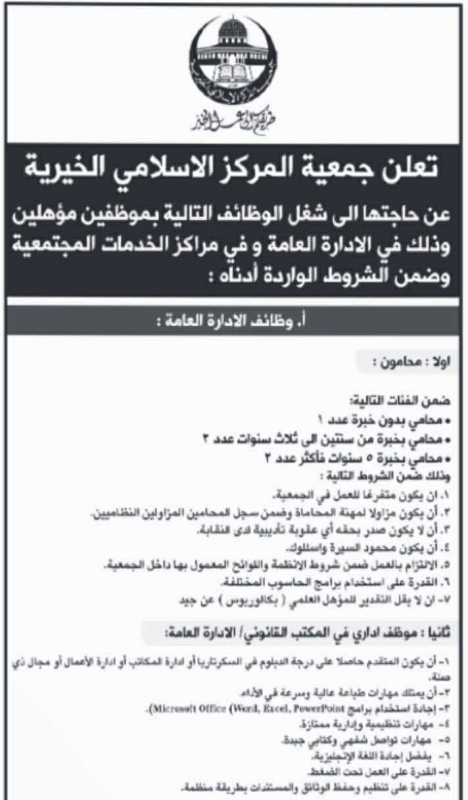 خبرني - أعلنت جميعة المركز الإسلامي عن حاجتها إلى شغل الوظائف التالية بموظفين مؤهلين وذلك في الإدارة العامة ومراكز الخدمات المجتمعية، وتاليا التفاصيل :