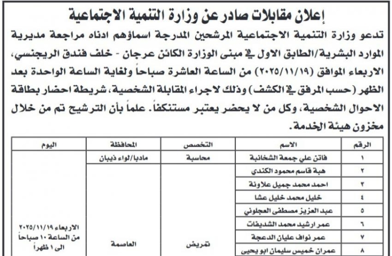 خبرني - أعلنت مؤسسات حكومية اليوم الأربعاء، عن حاجتها لتعبئة وظائف شاغرة، فيما دعت مؤسسات حكومية مرشحين لإجراء المقابلة الشخصية: