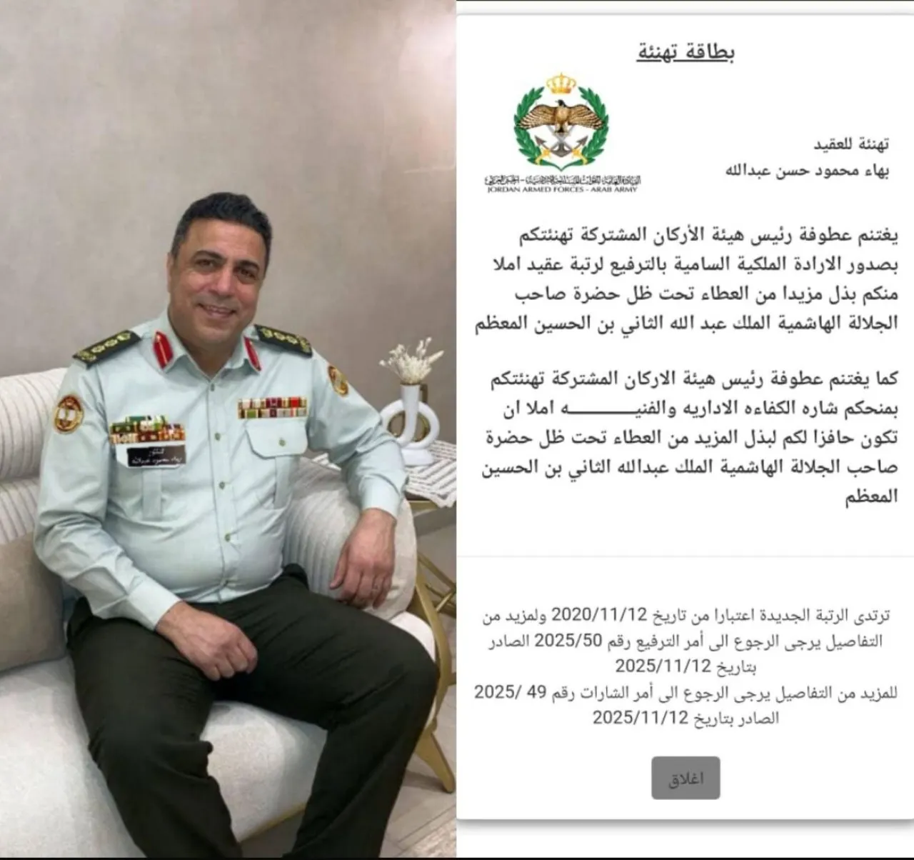 خبرني - المهندس حسن محمود عبدالله وأشقاؤه حسام وأحمد وعائلاتهم يباركون لشقيقهم العقيد الدكتور بهاء عبدالله بمناسبة الترفيع الى رتبة عقيد ، وحصوله على وسام الكفاءة الإدارية والفنية ، متمنينا له المزيد من التقدم والنجاح .
