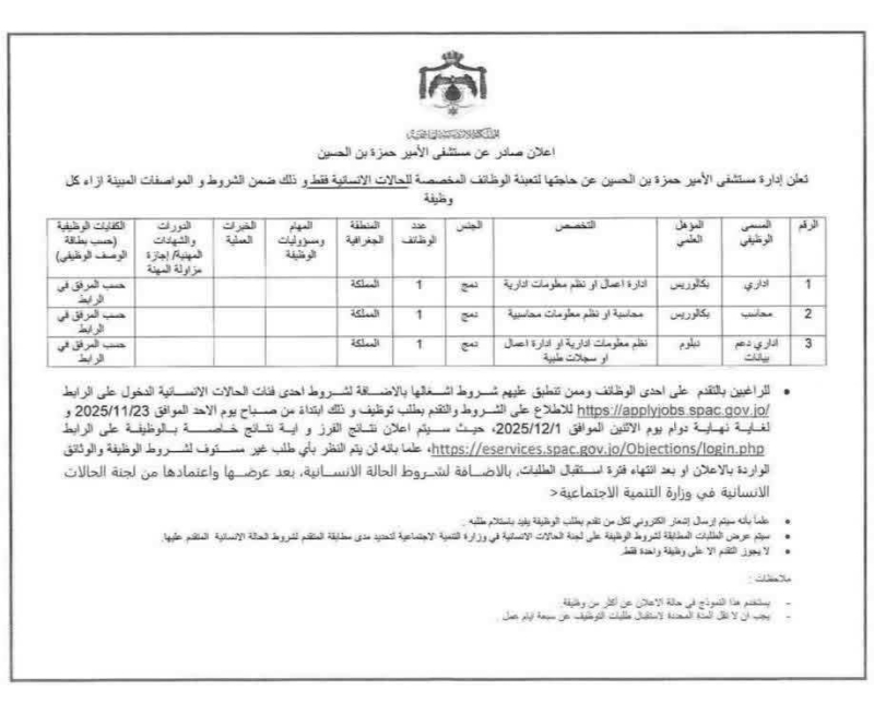 خبرني - أعلن مستشفى الأمير حمزة عن فتح باب التوظيف للحالات الإنسانية فقط، وذلك في عدد من التخصصات الإدارية والطبية المساندة، وفقًا للتفاصيل التالية: