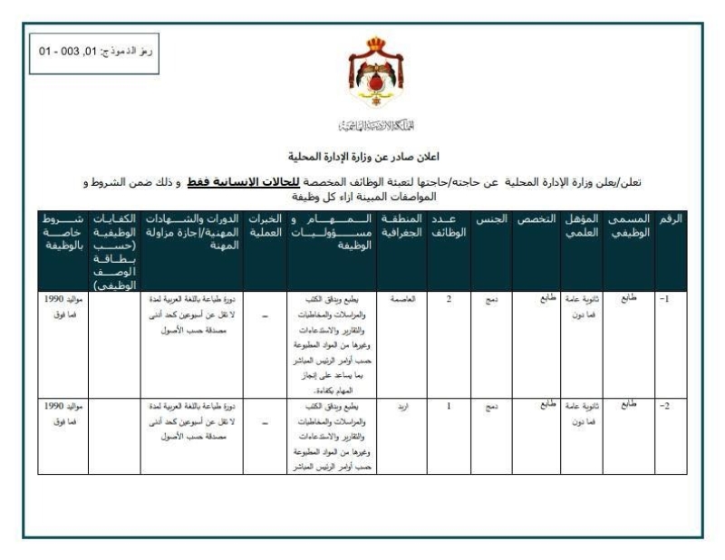 خبرني - أعلنت وزارة الإدارة المحلية عن فتح باب التقدّم لعدد من الوظائف المخصّصة "للحالات الإنسانية فقط"، وذلك ضمن الشروط والتعليمات المحددة.