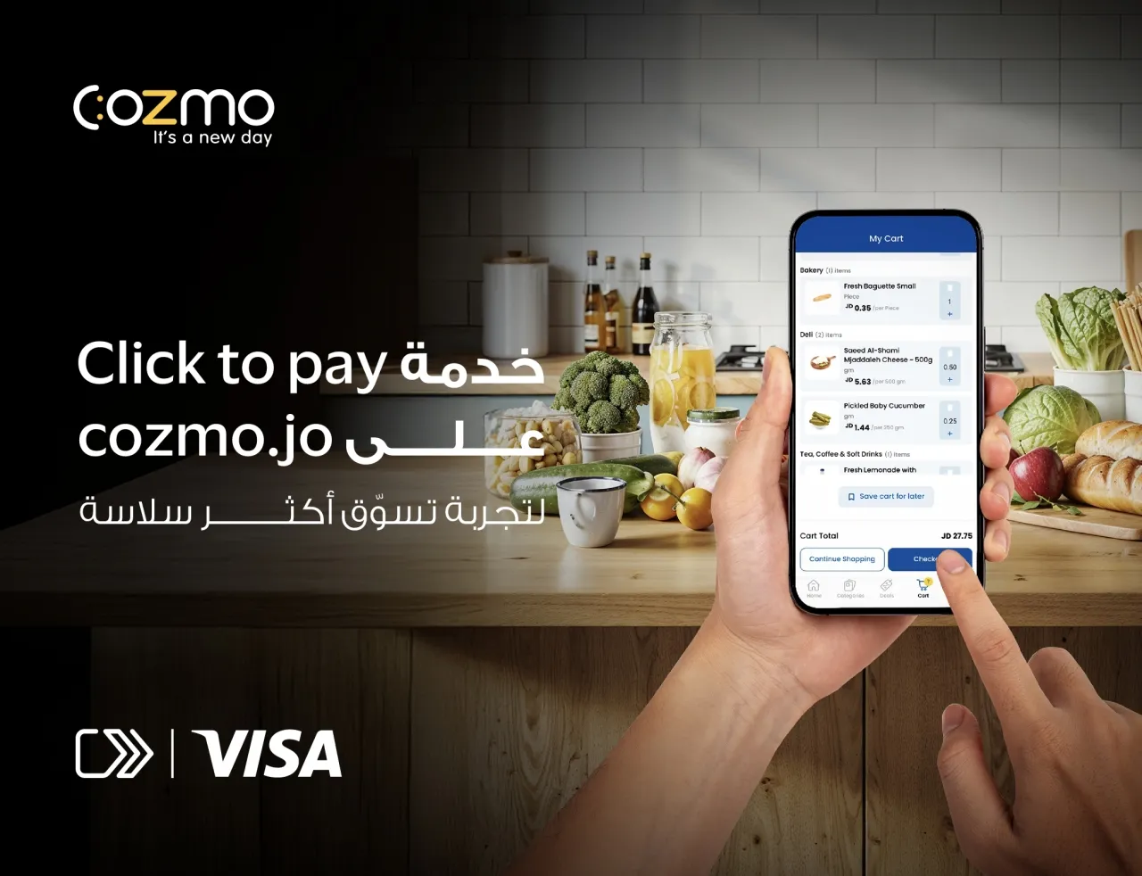 خبرني - أعلنت Cozmo.jo، المنصة الرائدة للتسوّق الإلكتروني في الأردن، بالتعاون مع فيزا، الشركة الرائدة عالميا فى مجال تكنولوجيا المدفوعات، عن إطلاق خدمة Visa Click to Pay لتكون بذلك أول موقع تسوّق إلكتروني في الأردن يقدّم هذه التجربة الجديدة للدفع الإلكتروني، والتي تهدف إلى جعل عملية الشراء عبر الإنترنت أسرع وأسهل وأكثر أماناً