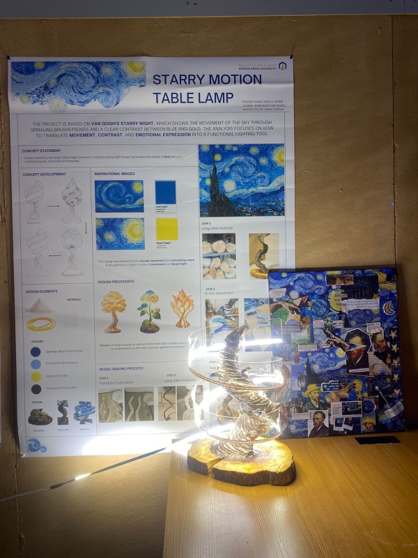 وخلال مراحل التنفيذ طوّر الطلبة مهاراتهم في قراءة الخامات واختيار المواد المناسبة، والتحكّم باتجاه الضوء وشدّته وتكوينه البصري، إضافةً إلى تنسيق الألوان والملامس بما يعزّز التجربة الحسية للمستخدم، كما أسهم المشروع في تعميق فهمهم لأهمية عملية التصميم التكرارية (Iterative Process) في صقل الأفكار وتحسين التفاصيل، من خلال إعداد نماذج تجريبية وتلقّي التغذية الراجعة ثم إعادة التطوير للوصول إلى منتج نهائي متكامل من حيث الفكرة والتنفيذ، وقد أظهر الطلبة مستوى رفيعًا من الإبداع والالتزام، فيما عكست الأعمال النهائية تنوّعًا غنيًا في مصادر الإلهام، وتعبيرًا بصريًا ناضجًا عن الهوية الفردية لكل طالب، إلى جانب دقة عالية في عمليات التصنيع والنمذجة.