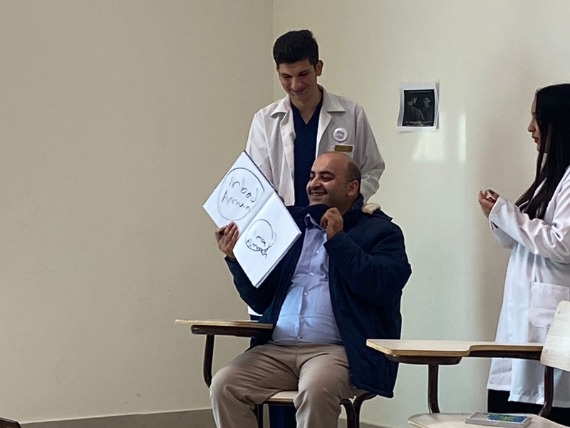 واستهلّ الطلبة الفعالية بتوزيع مرايا على الحضور لإتاحة الفرصة لهم لتجربة شعور المريض ورؤية الأمور من زاوية مختلفة، تلاها عرض مجموعة من الفيديوهات التي تضمّنت كلمات ونصائح من أعضاء الهيئة التدريسية وخريجي الكلية.