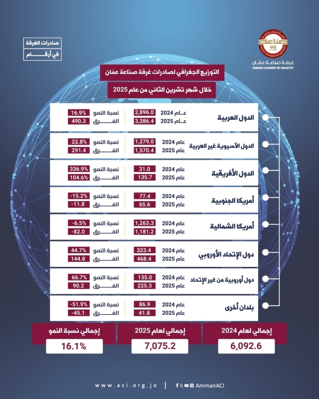 وبحسب إحصائية صناعة عمان، ارتفعت صادرات الغرفة وفق شهادات المنشأ التي أصدرتها منذ بداية العام الحالي وحتى نهاية شهر تشرين الثاني الماضي، 7.075 مليار دينار، مقابل 6.092 مليار دينار للفترة نفسها من 2024.