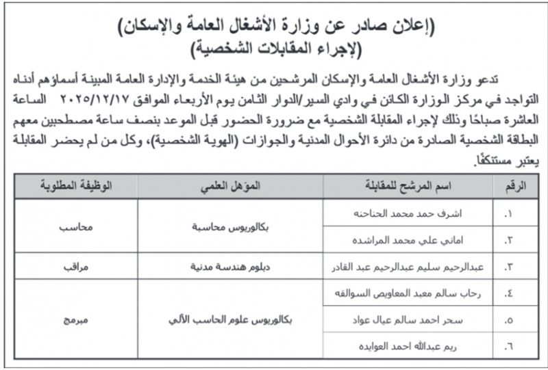 ودعت وزارة الأشغال عدد من المرشحين لإجراء المقابلات الشخصية، بغية استكمال إجراءات تعيينهم.