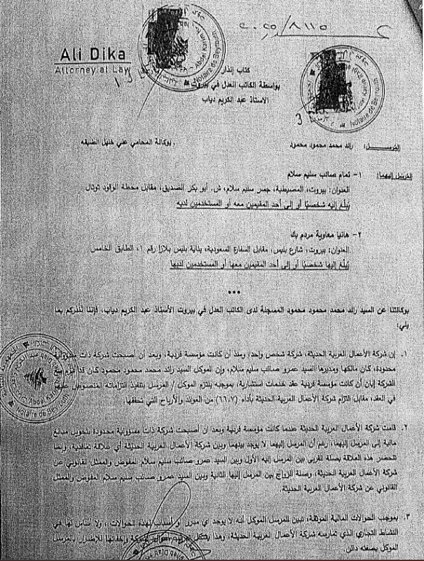 خبرني - كشفت وثيقة انذار عدلي تم توجيهه بواسطة الكاتب العدل في لبنان ان رجل الأعمال الأردني رائد محمد محمود سوف يتخذ اجراءات قانونية ضد رئيس الوزراء الأسبق تمام سلام بتهم ( الاحتيال و تهريب الاموال بقصد الاضرار بالدائنين ) وذلك بعد تحويل ملايين الدولارات من شركة الأعمال العربية إلى حسابات في سويسرا ولبنان