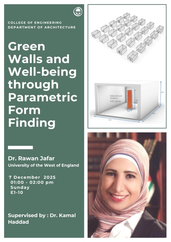 استمراراً لحرص كلية الهندسة في جامعة عمان العربية على دمج الجوانب النظرية بالجانب العملي والتطبيقي وتعزيز المعرفة التطبيقية لدى طلبة قسم هندسة العمارة وتطوير مهاراتهم في مجالات التصميم المستدام، وتنفيذاً لتوجيهات الأستاذ الدكتور محمد الوديان رئيس الجامعة، وبمتابعة مستمرة من الدكتور أنو العساف عميد كلية الهندسة في الجامعة، عقد قسم هندسة العمارة محاضرة بعنوان: "الجدران الخضراء والصحة عبر التصميم البارامتري"، قدمتها الدكتورة روان جعفر من جامعة غرب إنجلترا (UWE) ، بهدف تعزيز المعرفة التطبيقية لدى طلبة العمارة وتطوير مهاراتهم في مجالات التصميم المستدام.