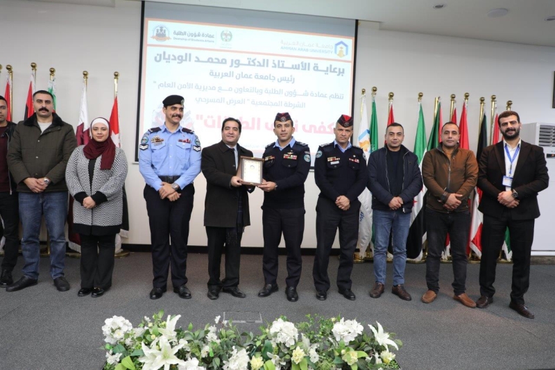 خبرني - تحت رعاية الأستاذ الدكتور محمد الوديان رئيس جامعة عمان العربية وانطلاقاً من مسؤولية الجامعة المجتمعية وحرصها على ترسيخ ثقافة السلامة المرورية وتعزيز الوعي بمخاطر الحوادث، نظمت عمادة شؤون الطلبة وبالتعاون مع مديرية الأمن العام/ الشرطة المجتمعية، عرضاً مسرحياً بعنوان: " كفى نزيف الطرقات" والذي قدمه الفريق المسرحي التابع لإدارة العلاقات العامة في الشرطة المجتمعية، وبحضور الدكتور محمد بن طريف عميد شؤون الطلبة مندوباً عن رئيس الجامعة، والرائد محمد بيك القرعان رئيس قسم الشرطة المجتمعية في محافظة البلقاء، وعدد من أعضاء الهيئتين التدريسية والإدارية وطلبة الجامعة.