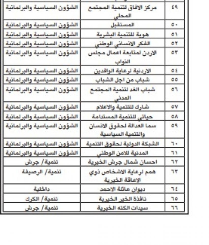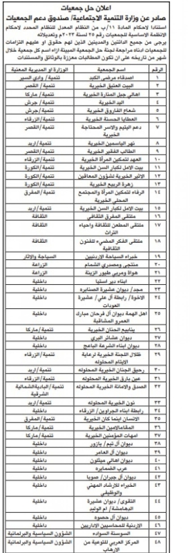 خبرني - أعلنت وزارة التنمية الاجتماعية، من خلال صندوق دعم الجمعيات، عن حلّ 66 جمعية، وذلك استنادًا إلى أحكام المادة (11/ب) من النظام المعدّل للنظام المحدِّد لأحكام الأنظمة الأساسية للجمعيات رقم (25) لسنة 2023 وتعديلاته.