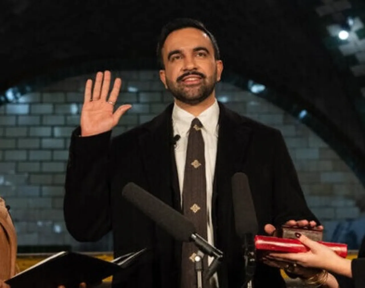The inauguration ceremony, managed by New York State Attorney General Letitia James, a political ally of his, took place at the old City Hall station, one of the first subway stations in the city, known for its stunning arched ceilings.