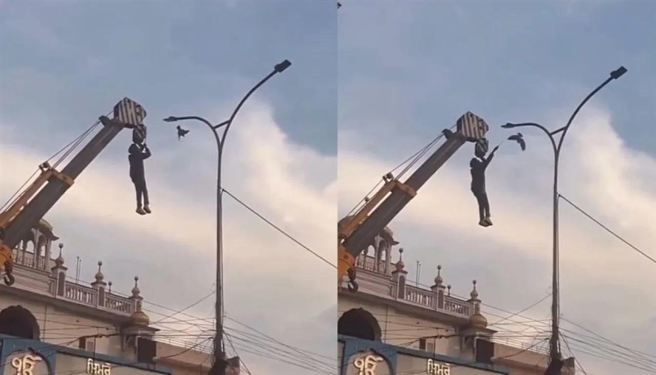 Khaberni - A video taken in the Indian state of Punjab records thrilling moments of a crane worker dangling in the air at a great height to rescue a bird stuck between tangled electrical wires.
