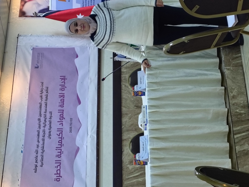 خبرني  - في إطار حرص جامعة عمان العربية على تعزيز الحضور في الفعاليات العلمية المتخصصة، وتأكيد دورها في دعم قضايا الصحة والسلامة المهنية، وحماية الإنسان والبيئة، بما يواكب التطورات العلمية والمهنية في مجالات التعامل مع المواد الكيميائية الخطرة، شاركت المهندسة عائشة الجراح من كلية الصيدلة في فعاليات اليوم العلمي الذي نظمته نقابة المهندسين الأردنيين بعنوان: "الإدارة الآمنة للمواد الكيميائية الخطرة ودور بطاقة البيان في الوقاية والحماية".