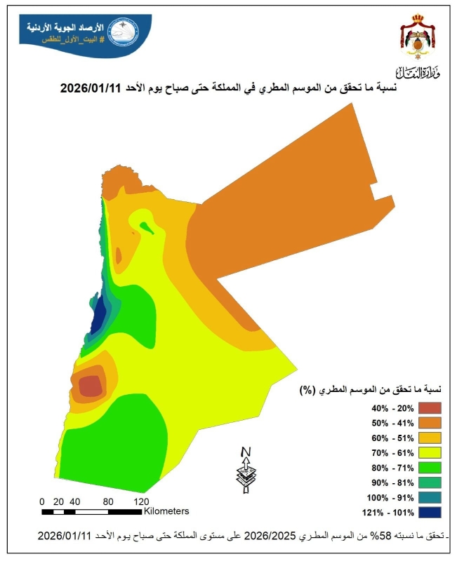 خبرني - نشرت إدارة الأرصاد الجوية الأردنية خريطة توضيحية تُبيّن نسبة ما تحقق من الموسم المطري في المملكة حتى صباح يوم الأحد 2026/01/11.