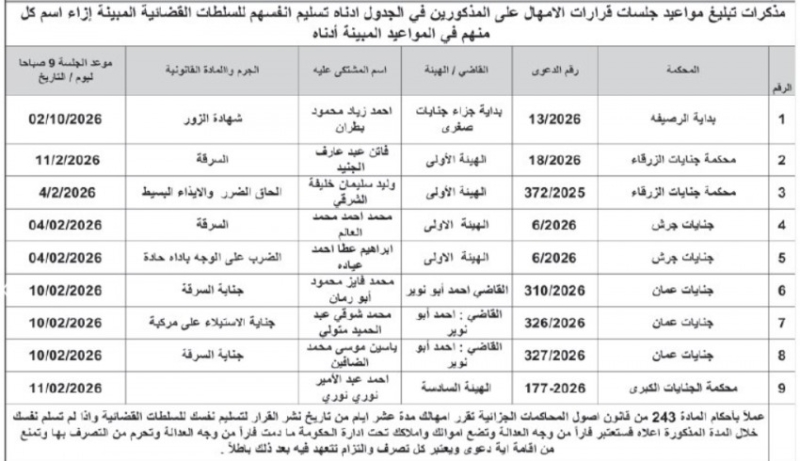 خبرني - صدرت اليوم الاثنين، مذكرات تبليغ بمواعيد جلسات وقرارات الامهال لتسليم مطلوبين أنفسهم للسلطات القضائية المبينة إزاء اسم كل منهم في المواعيد المبينة، وذلك عملا بأحكام المادة 243 من قانون اصول المحاكمات الجزائية.