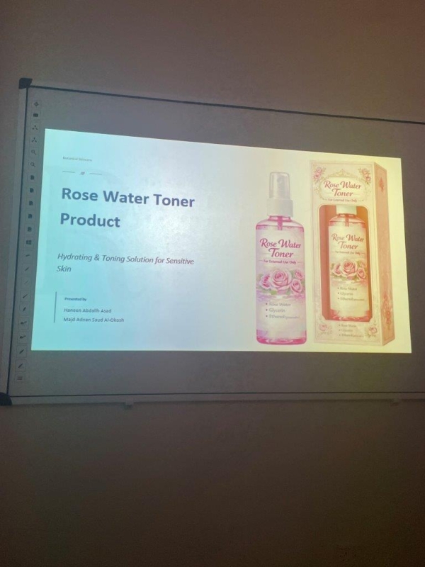 بينما قدمت المجموعة الثالثة والتي ضمّت كلاً من الطلبة: بتول جبر، وفاتنه عدس، وهبه البلبيسي، مقشراً طبيعياً مكوّناً من الأرز المطحون والزيوت الطبيعية يعمل على إزالة خلايا الجلد الميتة، وتحفيز تجدد الخلايا، وتحسين ملمس البشرة بشكل آمن، حيث يتميز هذا المقشر بكونه طبيعيًا وقليل التهييج، وسهل التحضير، مع إمكانية تعديل تركيبته لتناسب أنواع البشرة المختلفة، بينما أعدت المجموعة الرابعة والتي ضمّت كلاً من الطلبة: روسن الزواهره، وعامر نوافله، وموسى ابو عنزه، مرطبًا يوميًا للبشرة يعتمد على الجليسرين والزيوت الطبيعية للحفاظ على رطوبة الجلد ومنع الجفاف، مع توفير طبقة واقية تساعد على تحسين مرونة البشرة، وقد شمل عرض المشاريع توضيحاً للتفاصيل التركيبة وخطوات التحضير وآلية عمل كل مستحضر.