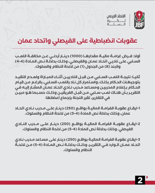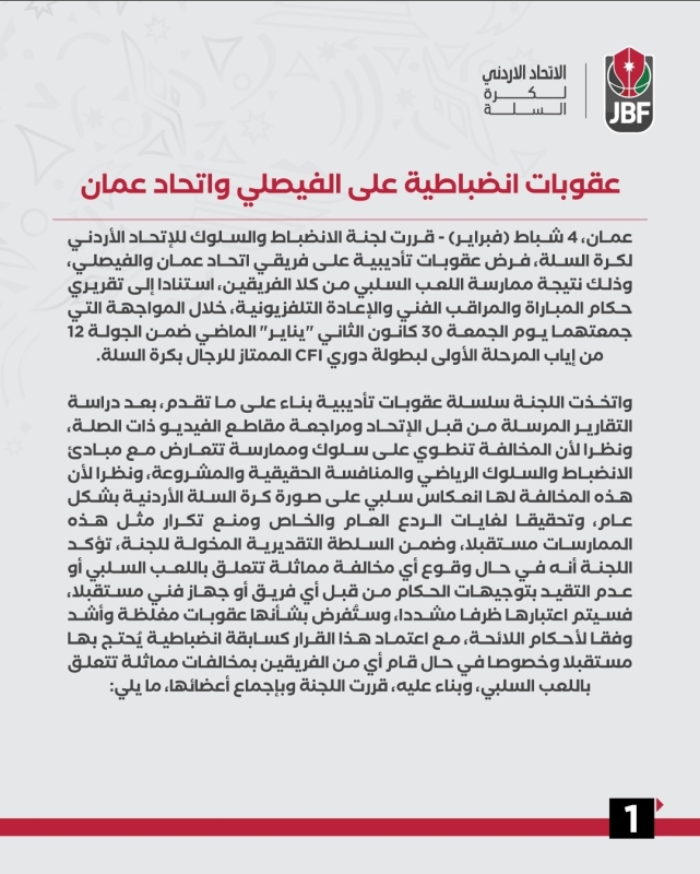 خبرني - قررت لجنة الانضباط والسلوك للاتحاد الأردني لكرة السلة، الأربعاء، فرض عقوبات تأديبية على فريقي الفيصلي واتحاد عمّان، وذلك نتيجة ممارسة اللعب السلبي من كلا الفريقين.