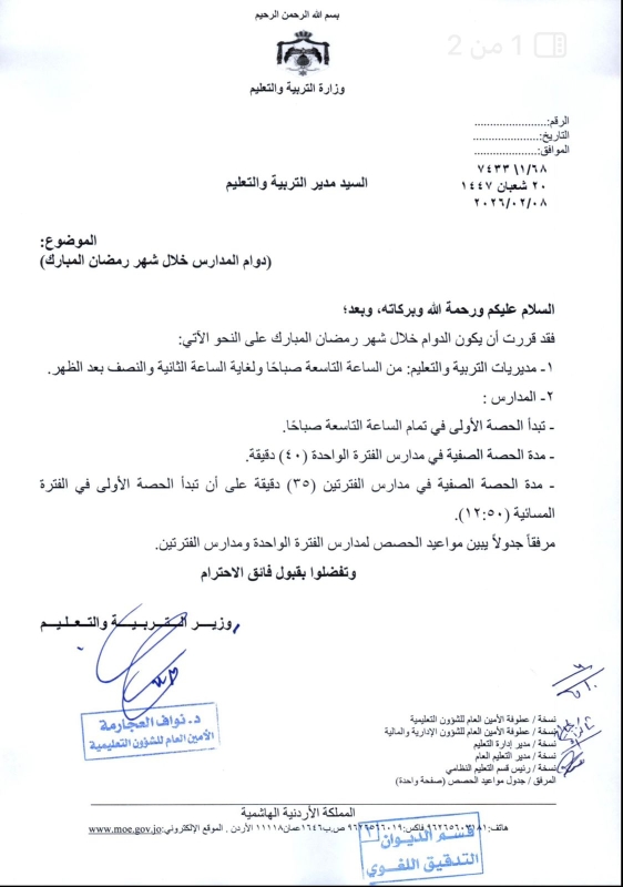 خبرني - عممت وزارة التربية والتعليم على مديريات التربية والتعليم أوقات الدوام الرسمي للمدارس، والتي سيتم العمل بها اعتبارًا من بداية شهر رمضان المبارك القادم.