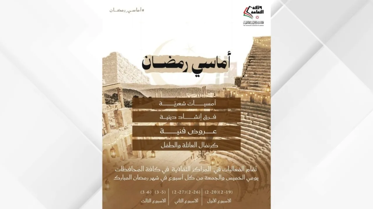 يشار إلى أنّ الأمسيات الرمضانية تقام في المراكز الثقافية في كافة محافظات المملكة، يوميّ الخميس والجمعة من كل أسبوع خلال شهر رمضان، من الساعة التاسعة والنصف مساءً حتى الثانية عشرة ليلاً، والدعوة عامة.