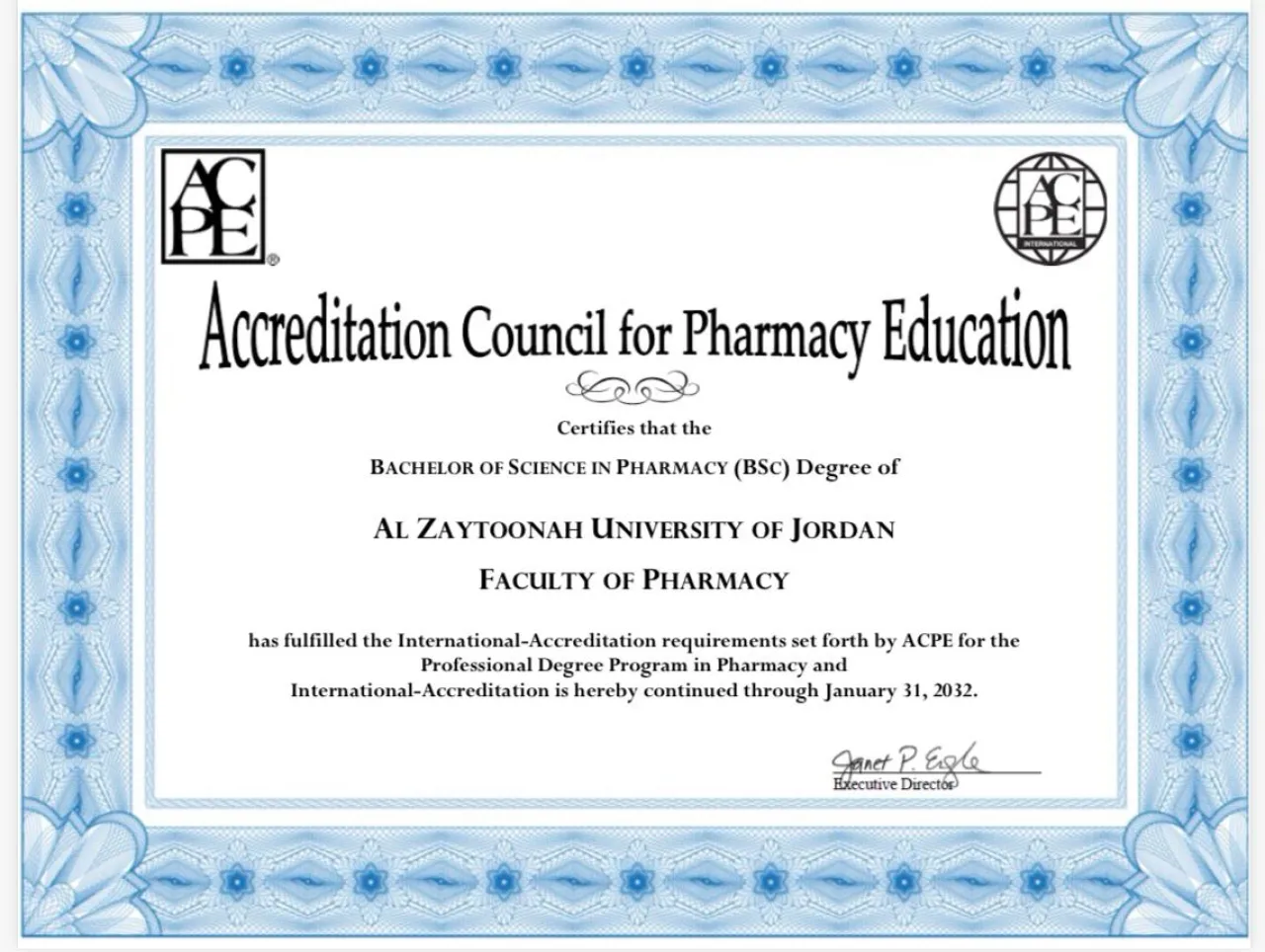 خبرني - حصلت كلية الصيدلة في جامعة الزيتونة الأردنية على تجديد الاعتماد الأمريكي الدولي من مجلس اعتماد الصيدلة الأمريكية (ACPE) لبرنامج البكالوريوس في الصيدلة ولمدة ستة سنوات وهي الفترة الاطول للاعتماد الأمريكي.