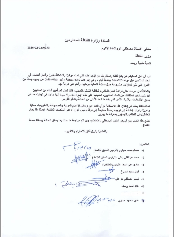 خبرني - شهد الوسط الثقافي تصعيداً جديداً تمثل في تقديم مجموعة من أبرز أعضاء جمعية اتحاد المنتجين الأردنيين للإعلام استقالاتهم الجماعية، وذلك في أعقاب قرار بحل الهيئة الإدارية المنتخبة وإلغاء نتائج الانتخابات التي جرت في وقت سابق من عام 2025.