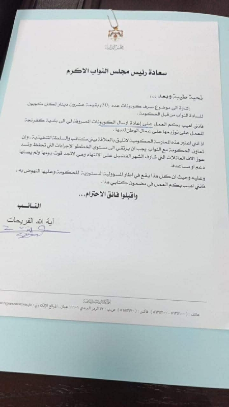 خبرني - وجه النائب آية الله الفريحات كتابا إلى رئيس مجلس النواب مازن القاضي  طلب فيه إعادة إرسال كوبونات المساعدات المصروفة للنواب إلى بلدية كفرنجة، للعمل على توزيعها على عمال الوطن.