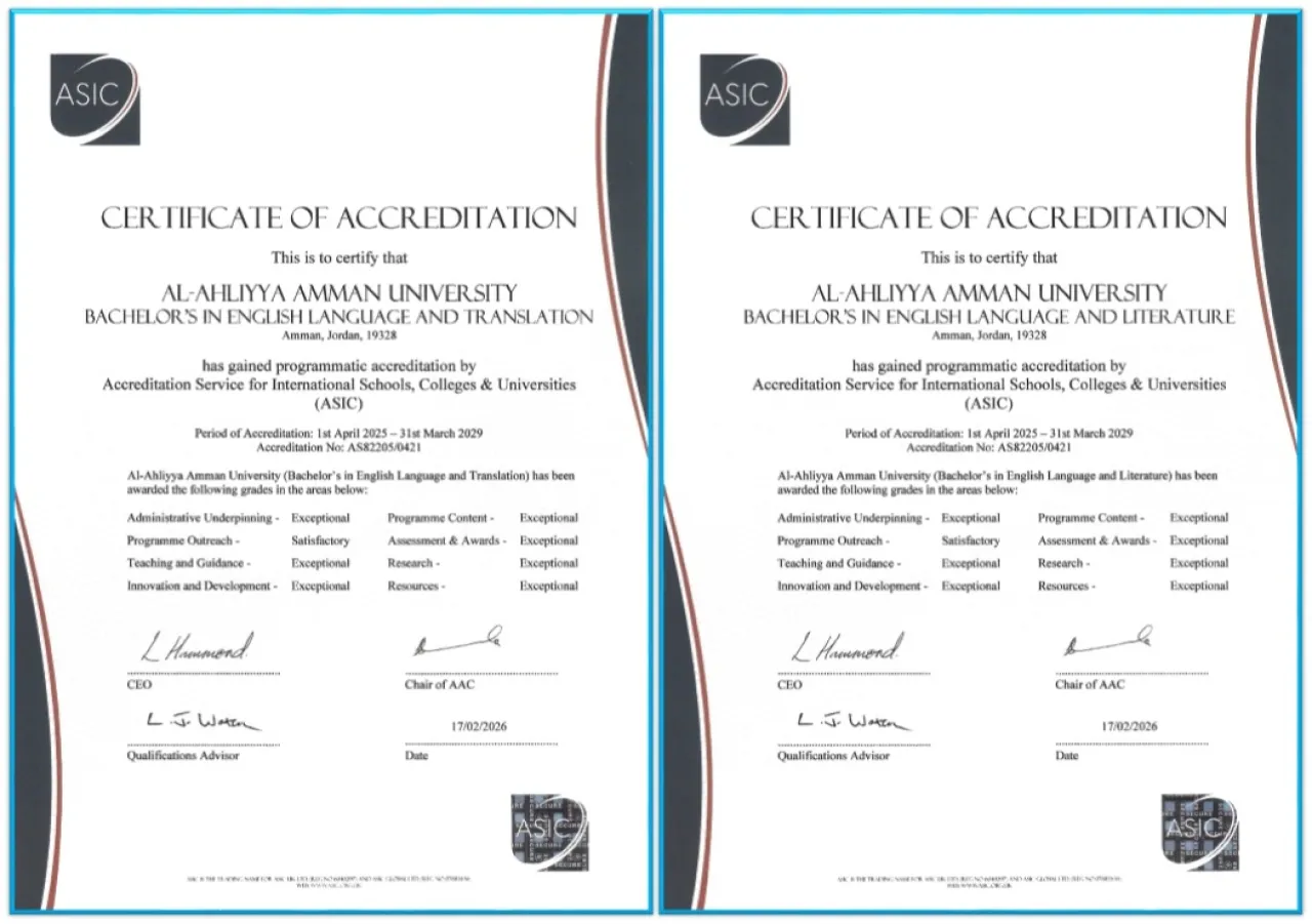 Khaberni - The Faculty of Arts and Sciences - Department of English at Al-Ahliyya Amman University has achieved a significant academic accomplishment by obtaining the British ASIC accreditation for the Bachelor programs in English Language and Literature and English Language and Translation according to the highest standard within the "Exceptional Excellence" category.