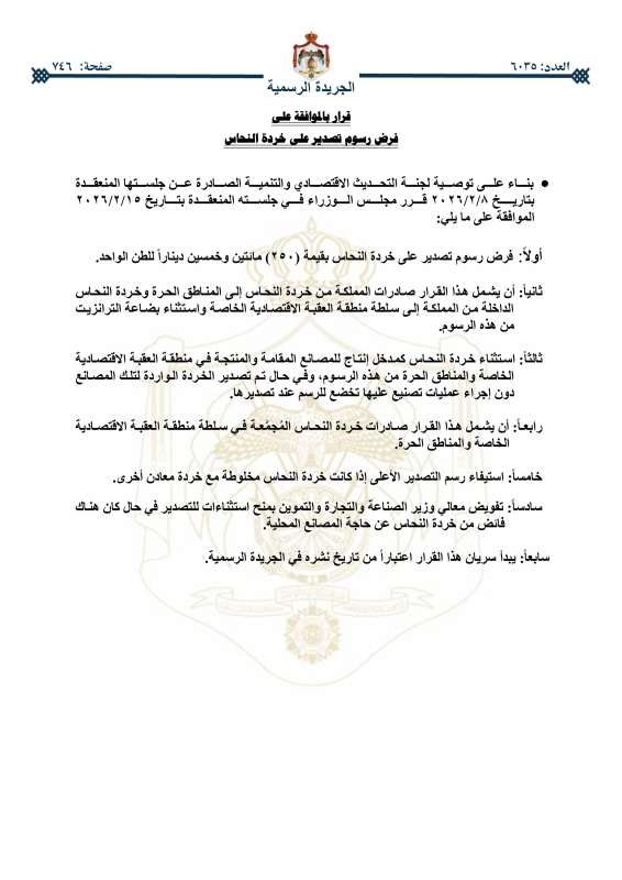 • ثانياً: أن يشمل هذا القرار صادرات المملكة من خردة النحاس إلى المناطق الحرة وخردة النحاس الداخلة من المملكة إلى سلطة منطقة العقبة الاقتصادية الخاصة واستثناء بضاعة الترانزيت من هذه الرسوم.
