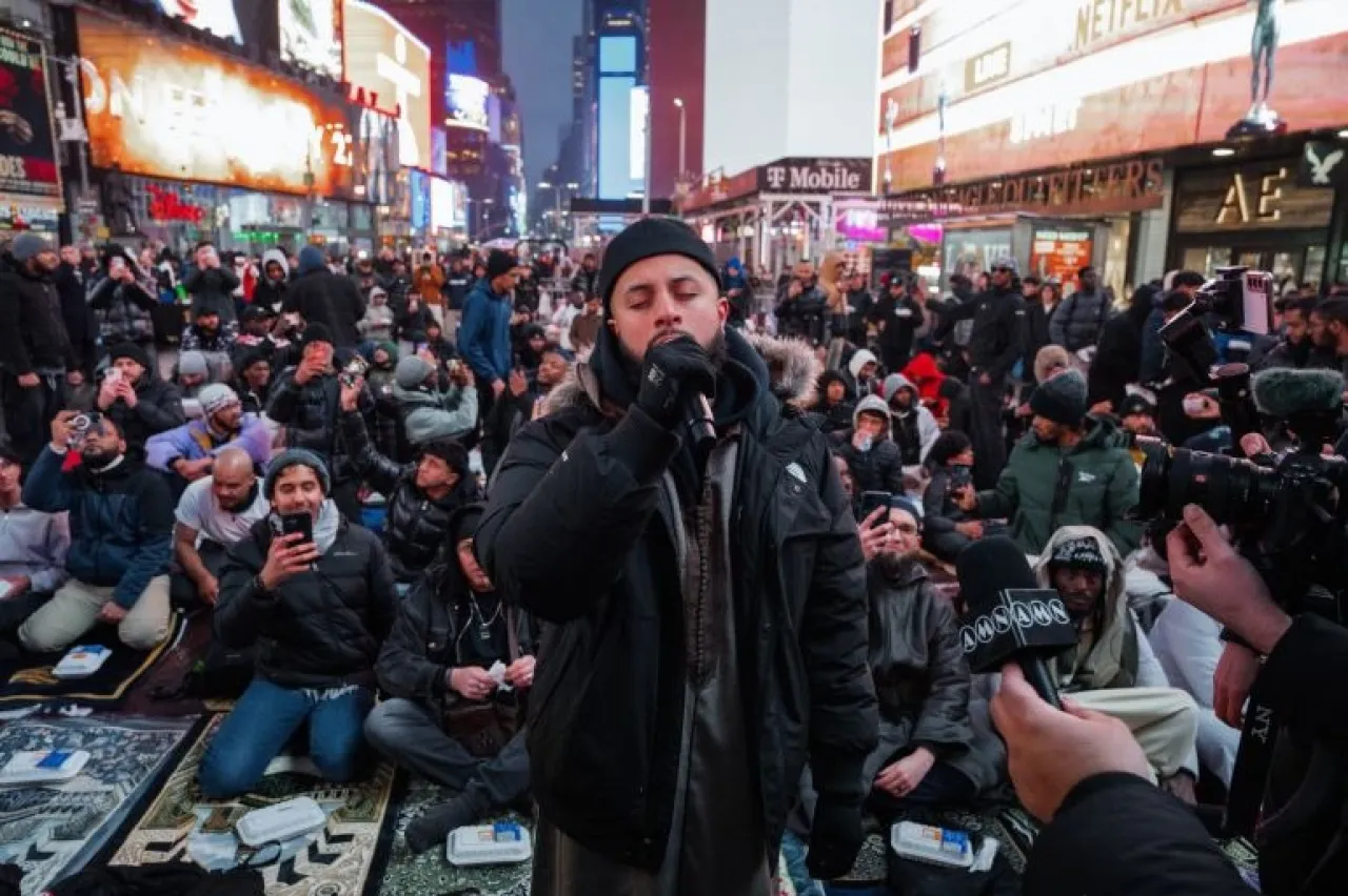 ورغم الأمطار الشتوية والطقس البارد، احتشد المصلون في ثالث أيام الشهر الفضيل بقلب مانهاتن، بين الأضواء الساطعة ولوحات الإعلانات العملاقة، حيث افترشوا الساحة لتناول الإفطار ثم أدّوا صلاة المغرب فالعشاء والتراويح، في مشهد بات يتكرر كل عام ويلقى تفاعلا واسعا على منصات التواصل.