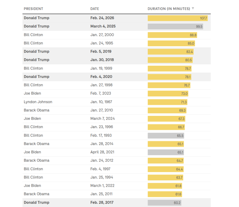 وبهذا يحطم ترامب الرقم القياسي الذي كان قد سجله بنفسه في العام الماضي، عندما تحدث لمدة ساعة و39 دقيقة في خطاب لم يكن من الناحية الفنية خطابا عن حالة الاتحاد، وذلك لأنها كانت السنة الأولى من ولاية ترامب الثانية غير المتتالية، وهو ما حال دون تصنيفه كخطاب حالة اتحاد. وقبل ذلك، كان الرقم القياسي مسجلا باسم الرئيس الأسبق بيل كلينتون عن خطابه عن حالة الاتحاد عام 2000، والذي بلغت مدته ساعة و28 دقيقة.