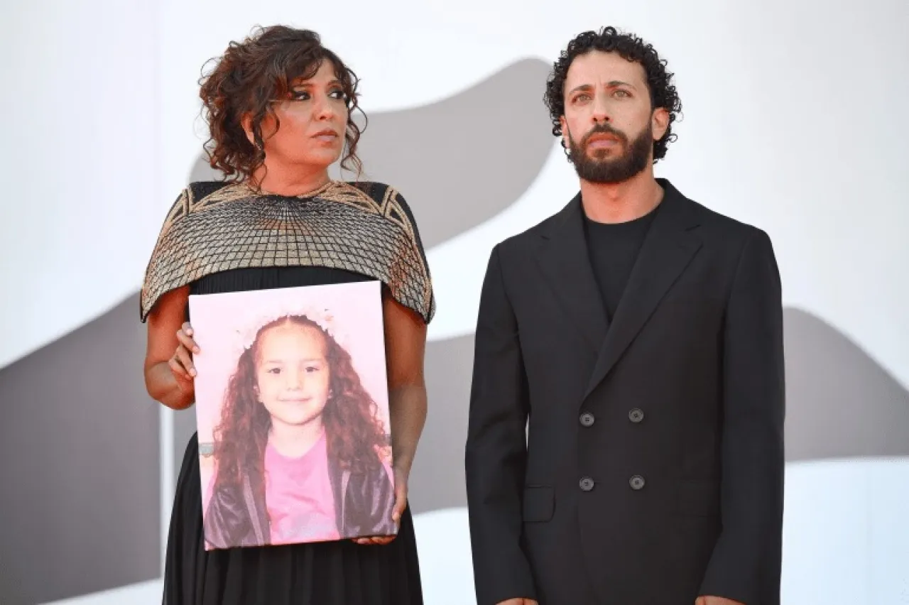 المخرجة التونسية كوثر بن هنية والممثل الفلسطيني معتز ملحيس في مهرجان البندقية السينمائي