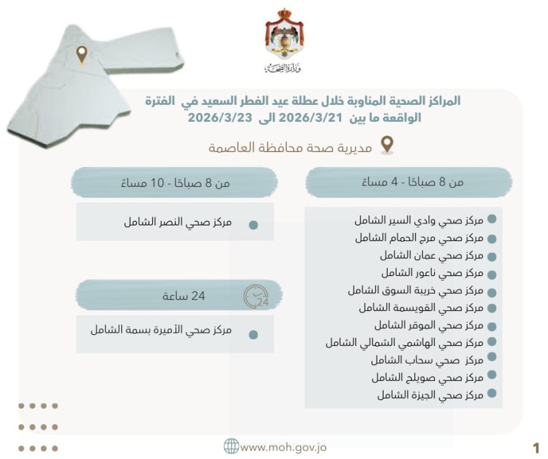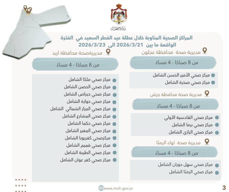 خبرني - أُعلنت أسماء المراكز الصحية المناوبة خلال عطلة عيد الفطر السعيد، في الفترة الواقعة ما بين 21 و23 آذار/مارس 2026، في جميع محافظات المملكة، والبالغ عددها 106 مراكز صحية.