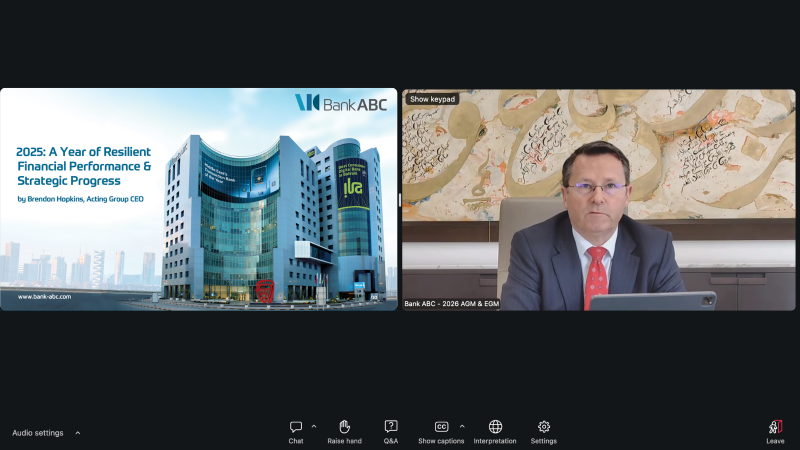 خبرني - عقد بنك ABC (المؤسسة العربية المصرفية ش.م.ب.) اجتماع الجمعية العامة العادية وغير العادية إلكترونيًا بتاريخ 26 مارس 2026، وقد ترأس كلا الاجتماعين رئيس مجلس إدارة المجموعة سعادة السيد / ناجي بلقاسم.