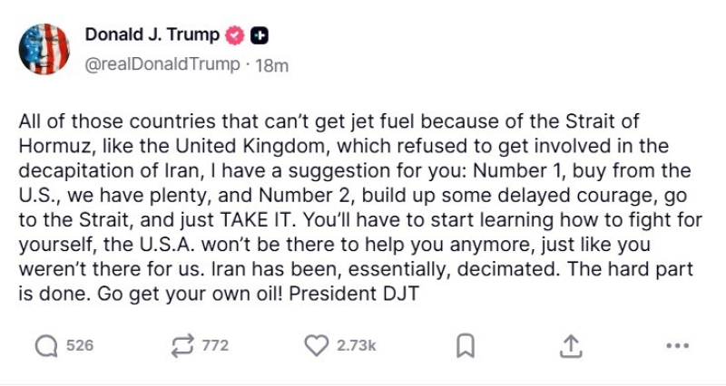 وقال ترمب في منشور عبر منصته "تروث سوشيال" إن بريطانيا من بين الدول التي لم تعد قادرة على الحصول على وقود الطائرات بسبب إغلاق مضيق هرمز، مشيرا إلى أنها رفضت المشاركة في "عملية قطع رأس النظام الإيراني".