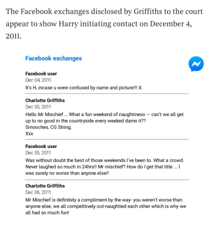 ويبدو أن الرسائل تُظهر أن هاري هو من راسل شارلوت أولًا، وكتب: "أنا هاري، في حال اختلط عليكِ الأمر بين الاسم والصورة!!!".