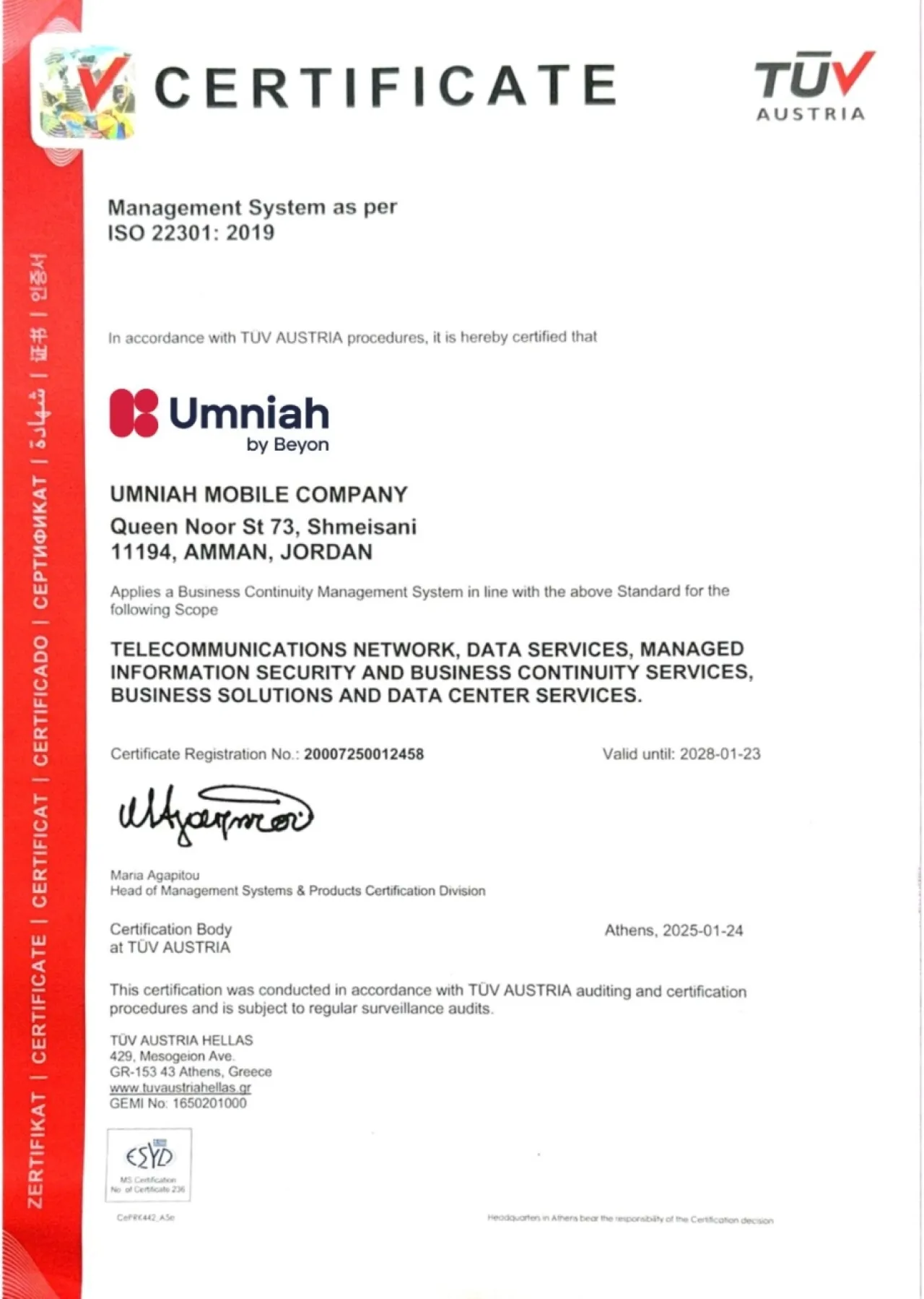Khaberni - Umniah, a company of Beyon and rated the best mobile network in Jordan, has renewed its ISO 22301 business continuity management system certificate. This move reflects its operational readiness and ability to ensure the continuity of business and services under various conditions, enhancing the reliability of its network for individuals and organizations in the Kingdom.