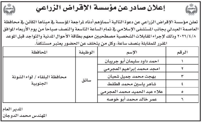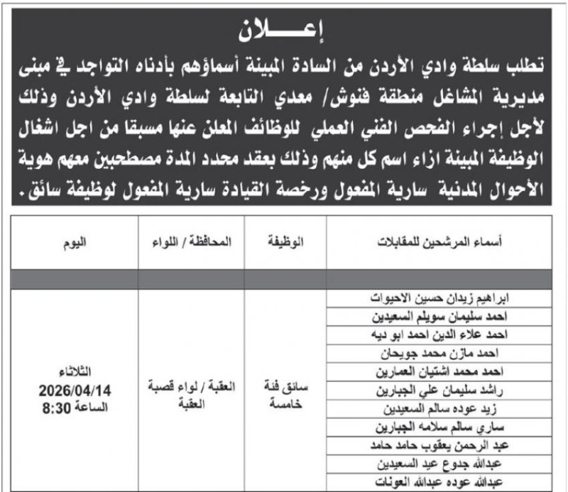 خبرني - أعلنت مؤسسات وشركات حكومية اليوم الاثنين عن حاجتها لتعبئة شواغر مختلفة، فيما اعلنت اخرى عن دعوة اشخاص لاجراء المقابلات الشخصية، والفحص الطبي للوظيفة.