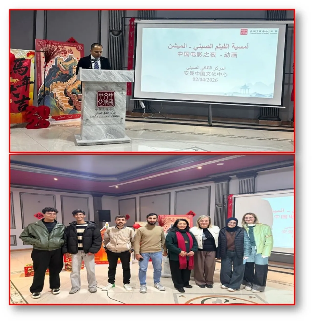 Khaberni - Students of the Chinese-English language specialization (double major) from the Department of Languages at the Faculty of Arts and Sciences at Al-Ahlia Amman University participated in the Chinese Film Evening at the Chinese Cultural Center in Amman, which was inaugurated with a cultural speech delivered by Mr. Zhao Xiaoqiang, the cultural adviser at the Chinese Embassy and director of the Chinese Cultural Center in Amman.