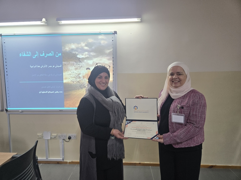 وفي ختام اللقاء أعربت الدكتورة أبوحويج عن شكرها وتقديرها للخريجين على مشاركتهم الفاعلة، والتي تعكس عمق انتمائهم للكلية والجامعة، كما كرّمت الصيدلانية الفلسطينية عبد السلام تيم بمنحها درع التميز، تقديرًا لجهودها ودورها التوعوي البارز في الحد من ظاهرة الإدمان، ودعم برامج العلاج والتأهيل، مما يعزز نشر الوعي ويسهم في بناء مجتمع أكثر صحة.