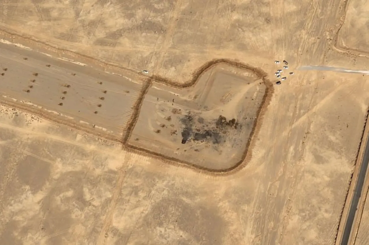 The image, taken on April 10th of this year, shows large black marks at the eastern end of the 1200-meter long runway, likely from the burning aircraft, and several vehicles near the end of the runway are also visible.
