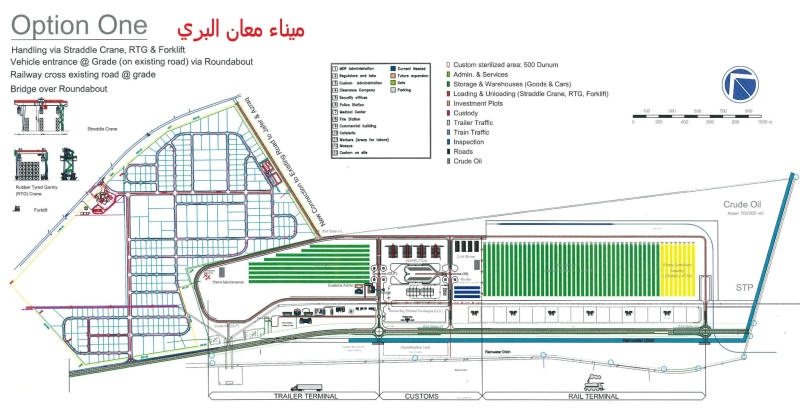 وقد ساهمنا بإعداد التصاميم الأولية لميناء معان البري عام 2017 لصالح شركة تطوير العقبة، إلا أن غياب سكة حديد حديثة آنذاك حدّ من جدواه، في ظل الاعتماد على سكة حديد العقبة ذات العرض الضيق (1.1 متر).