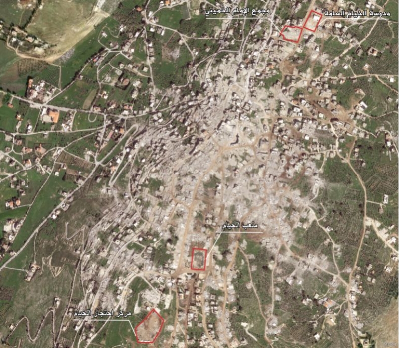 وتظهر الصور اختفاء كتل سكنية كاملة وتسوية مبان ومنشآت بالأرض، إلى جانب أضرار طالت عددا من المواقع الحيوية، من بينها مركز احتجاز الخيام الذي دمر بالكامل، وملعب البلدة، ومجمع الإمام الخميني، ومدرسة الخيام العامة، فضلا عن الطرق الرئيسية داخل البلدة.