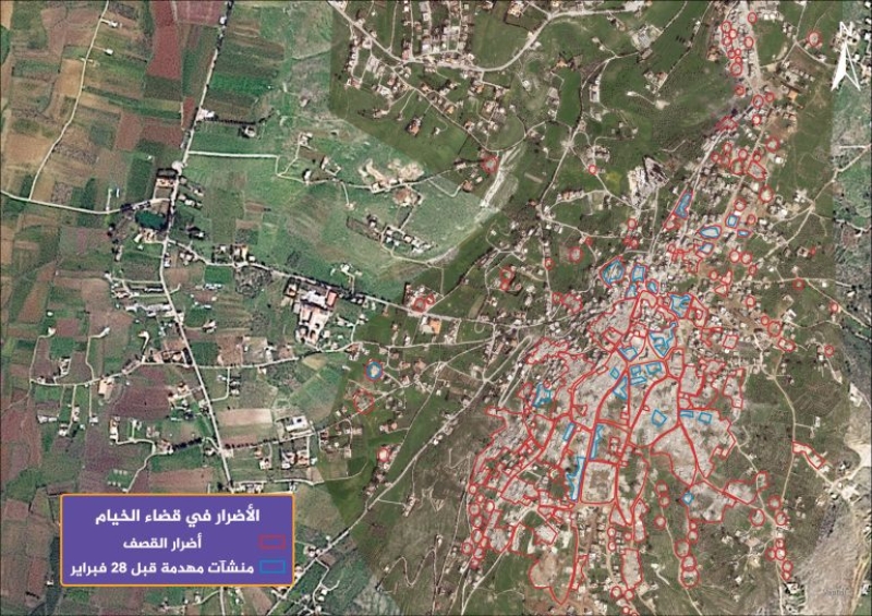 ويظهر هذا النمط بوضوح في الخيام، حيث أصبح الاستهداف أقرب إلى المسح الشامل، ولم يعد الدمار محصورا في نقاط متفرقة، بل امتد إلى مساحات واسعة من النسيج العمراني، بما يوحي بانتقال العمليات من ضربات موضعية إلى تدمير واسع النطاق يطال البنية العمرانية نفسها.