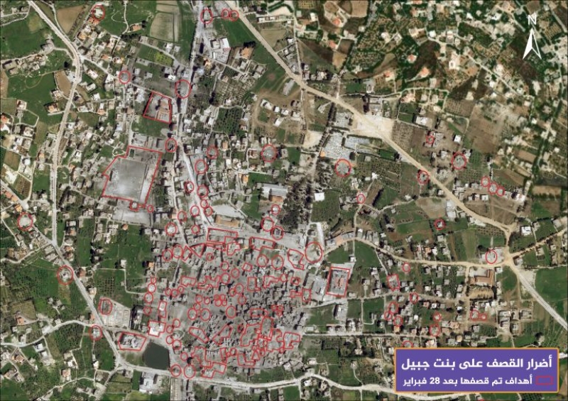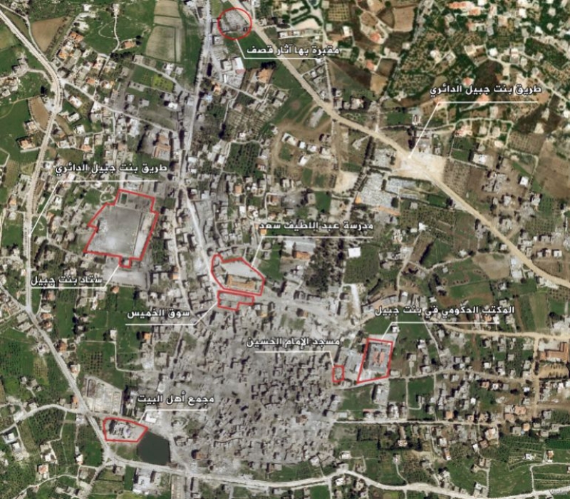 وتكشف الصور اختفاء مبان كانت قائمة قبل أسابيع، إلى جانب أضرار جسيمة لحقت بعدد من المواقع البارزة داخل المدينة، بينها مدرسة عبد اللطيف سعد، ومجمع أهل البيت، ومسجد الإمام الحسين، والمكتب الحكومي لقضاء بنت جبيل، وسوق الخميس، إضافة إلى مبان محيطة بمقبرة بنت جبيل وطريق بنت جبيل الدائري.