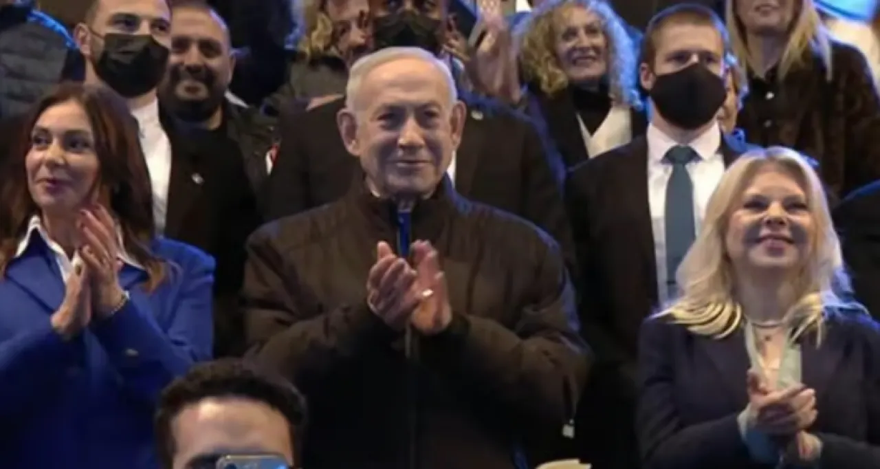 Television screens showed Netanyahu standing with his wife Sara on his left side, and on his right side, the Minister of Transport Miri Regev, who was responsible for organizing the event.